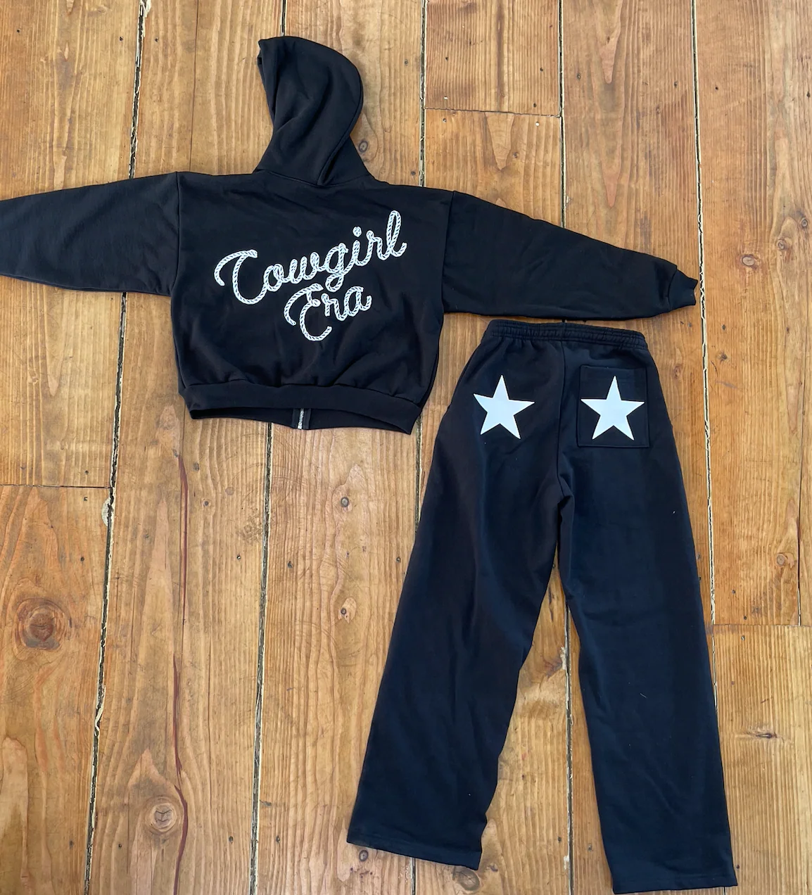 Say hello to the ultimate in comfort and style with our Black Star Sweatpants! Pair them with our matching cropped zip-up "Cowgirl Era" Hoodie or your favorite White Star Tank for a complete look!