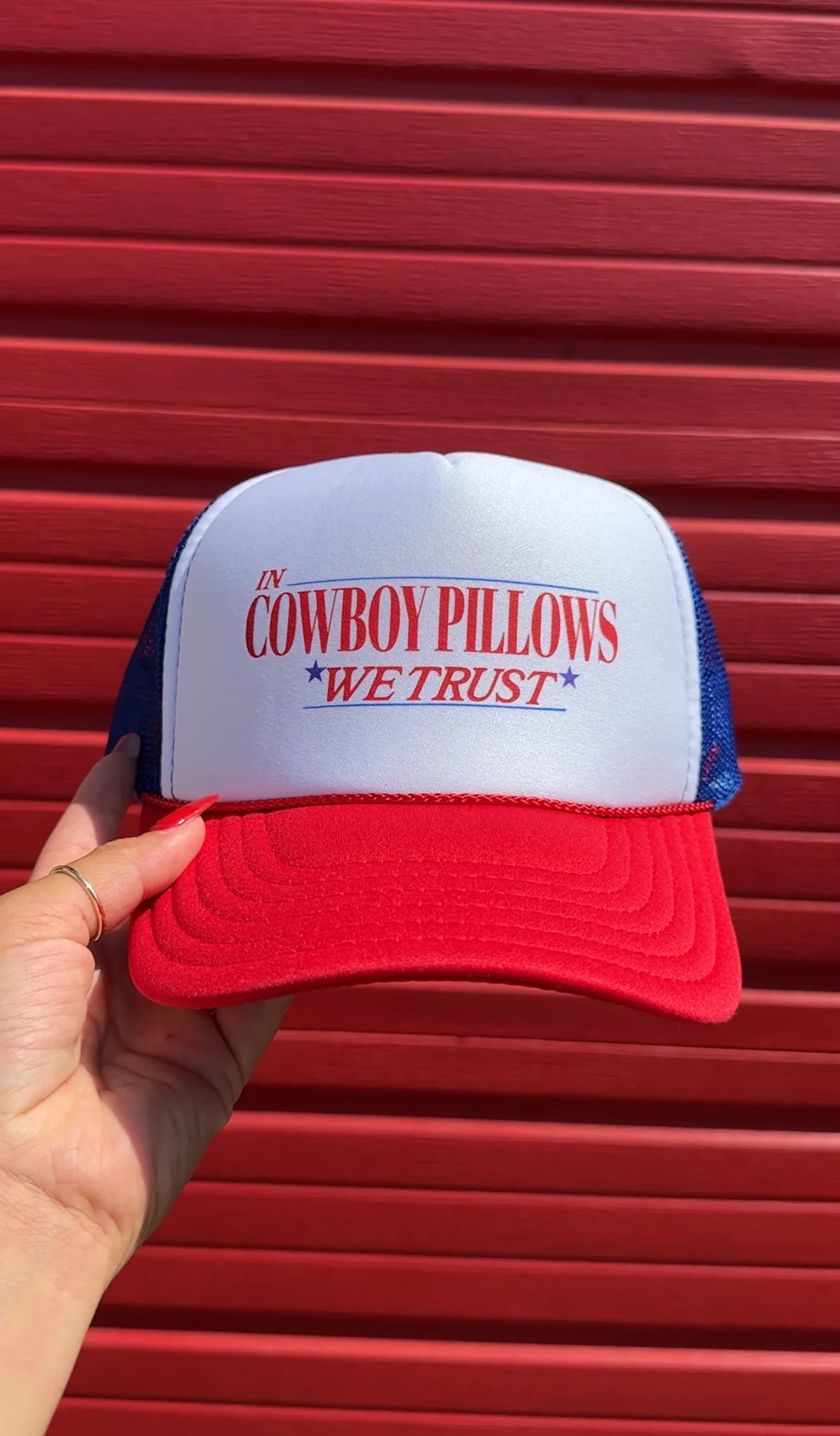 Show off your patriotic cowgirl spirit with our "In Cowboy Pillows We Trust" Trucker Hat! This bold, red, white, and blue mesh foam hat features the perfect combination of style and country pride.